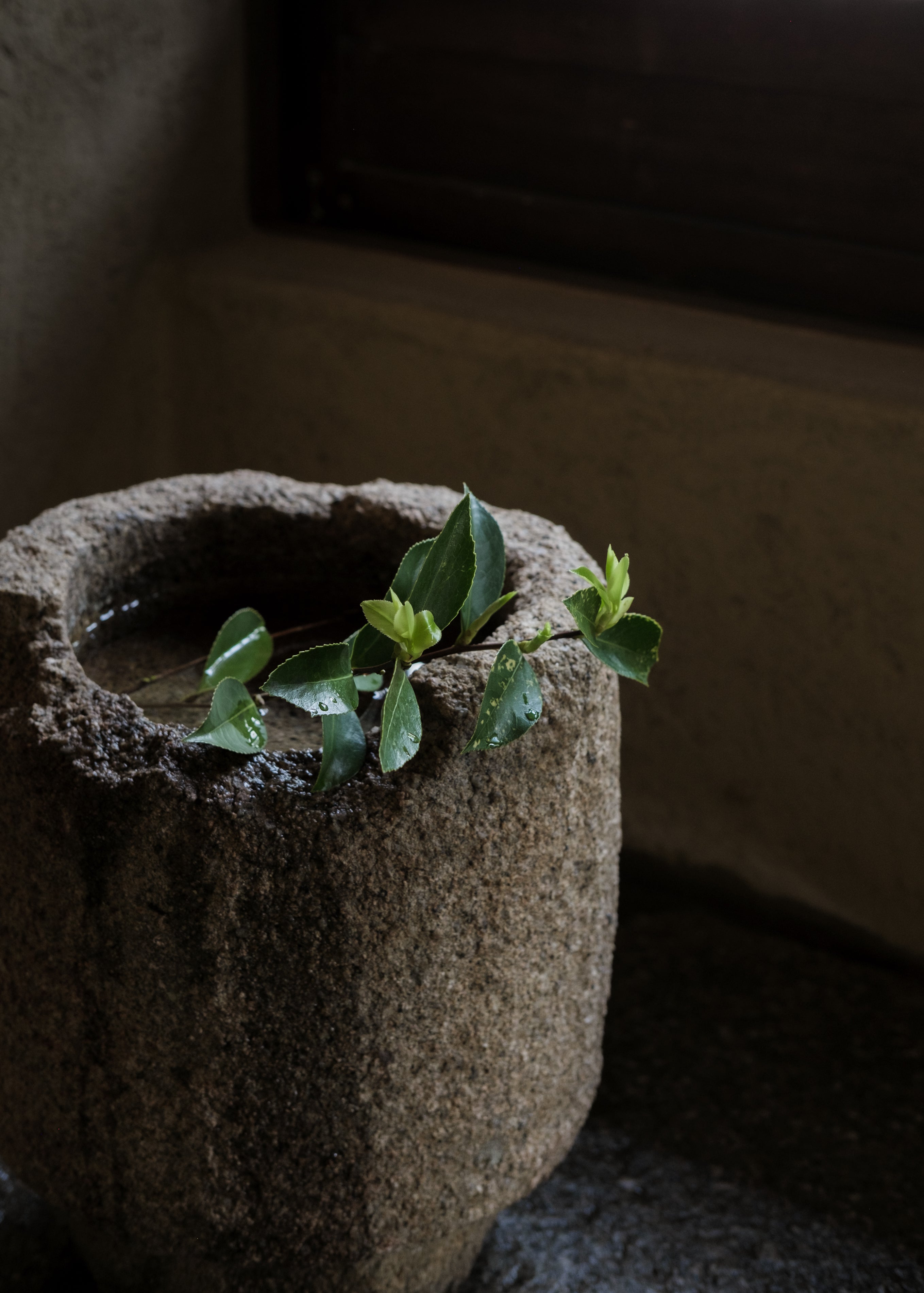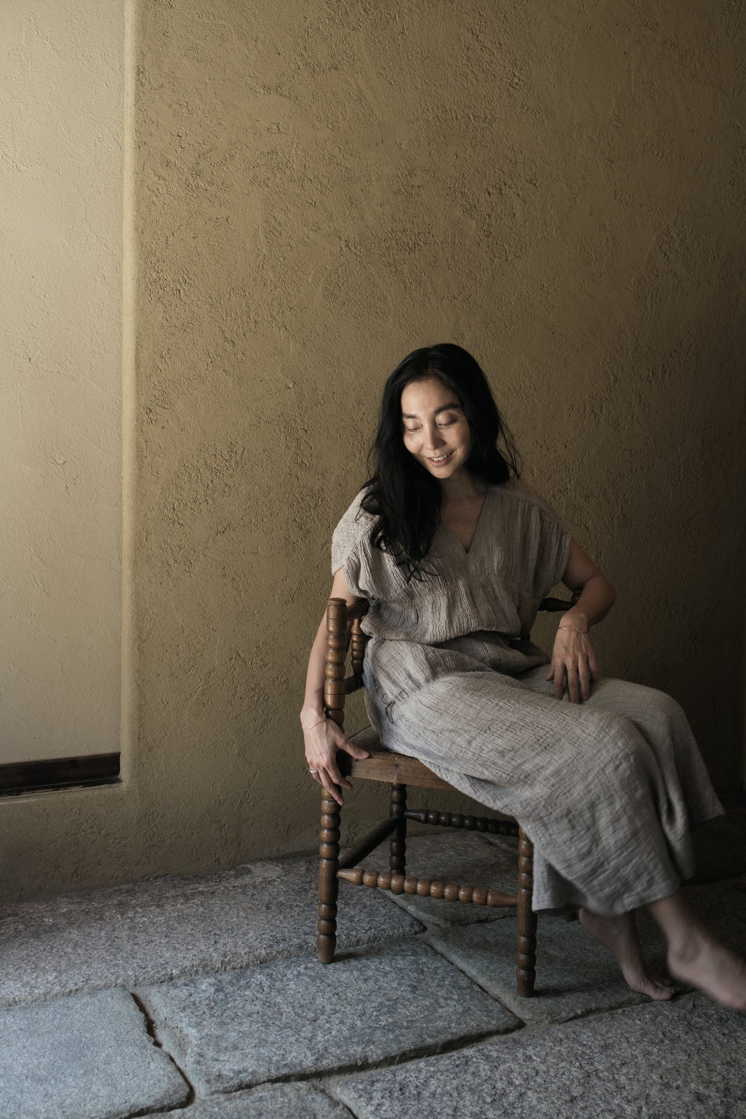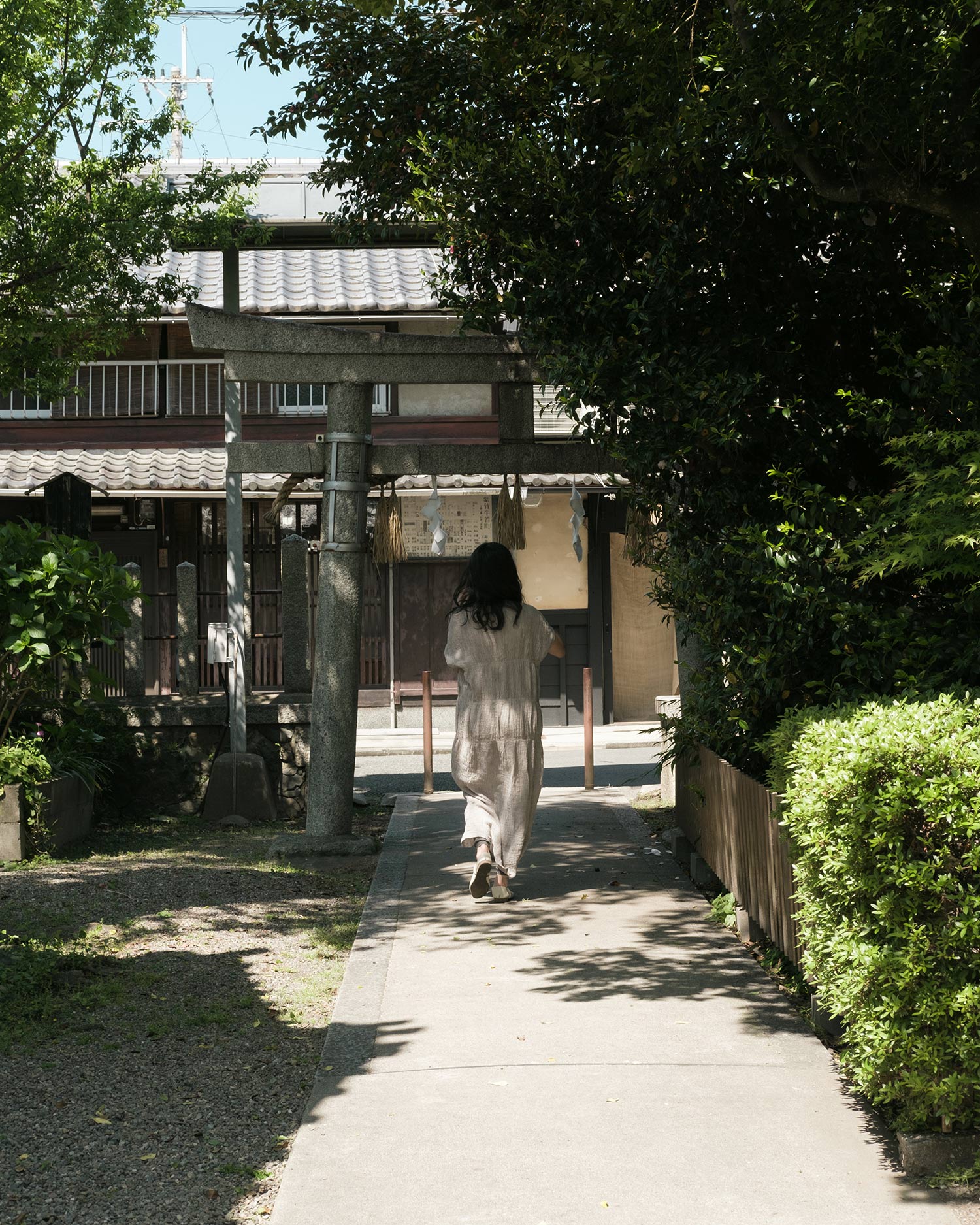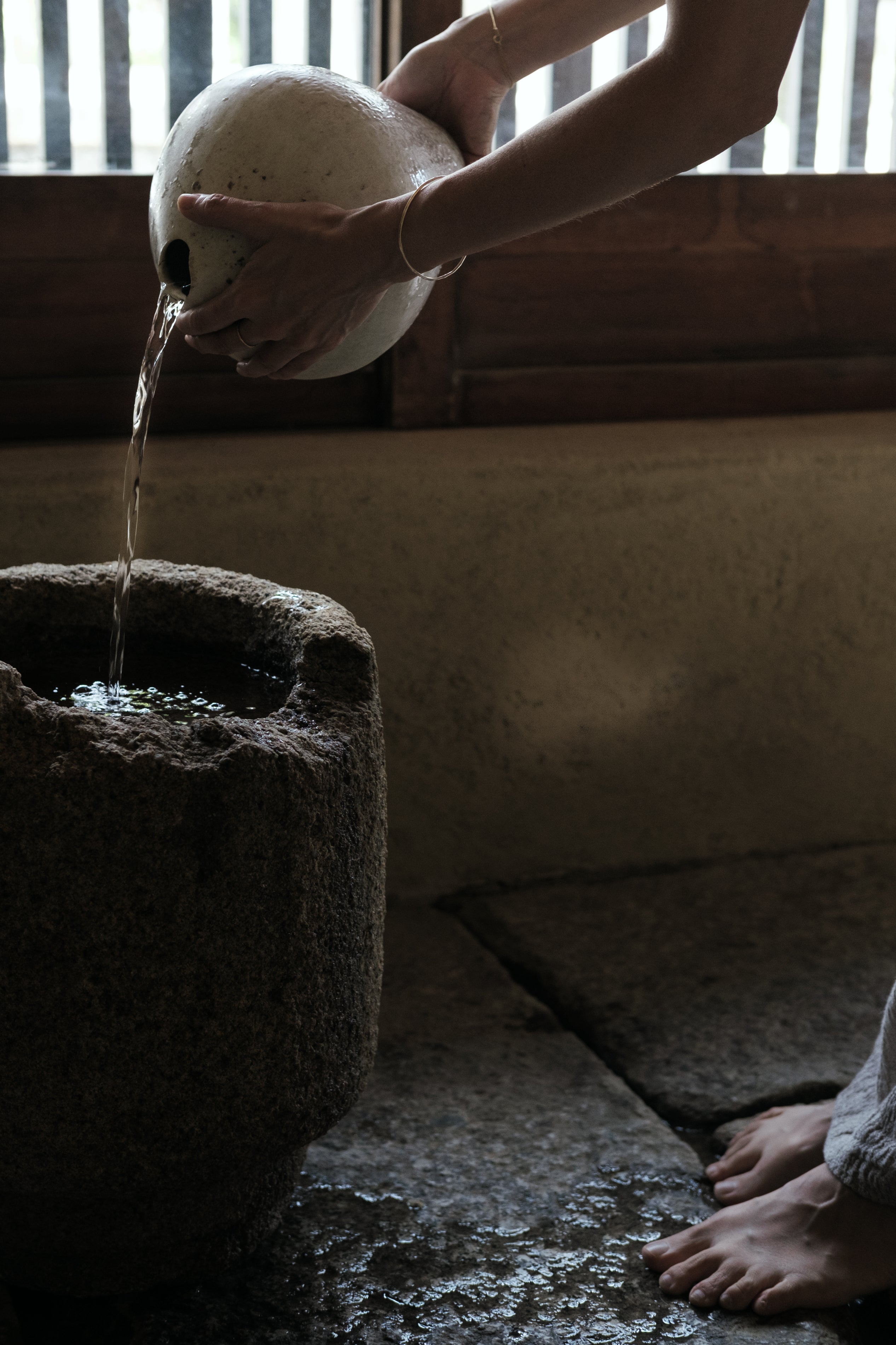 Kana purifies the beautiful stone-paved entrance with Uchimizu to ensure a warm welcome for guests. She looks charming with her barefoot.