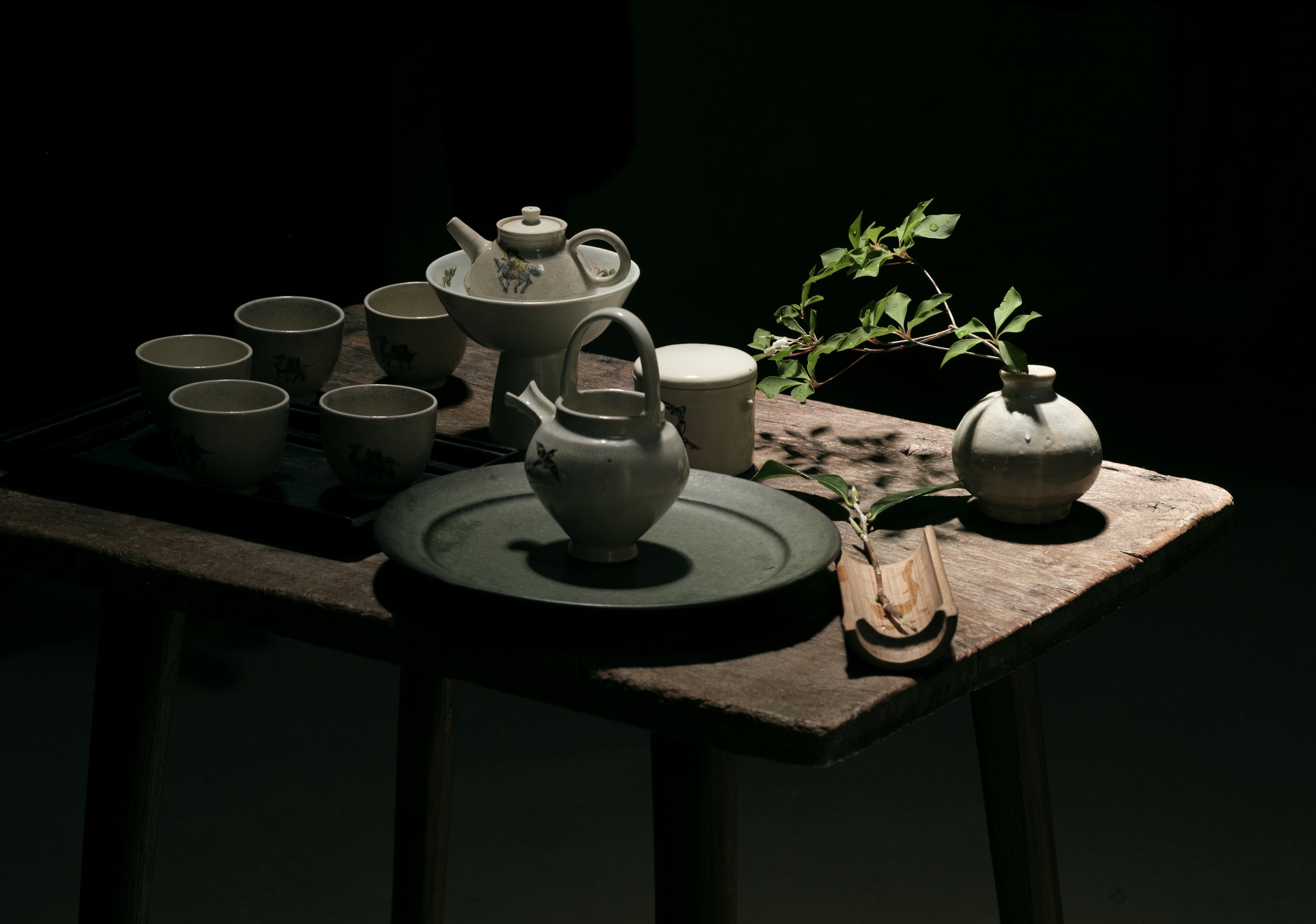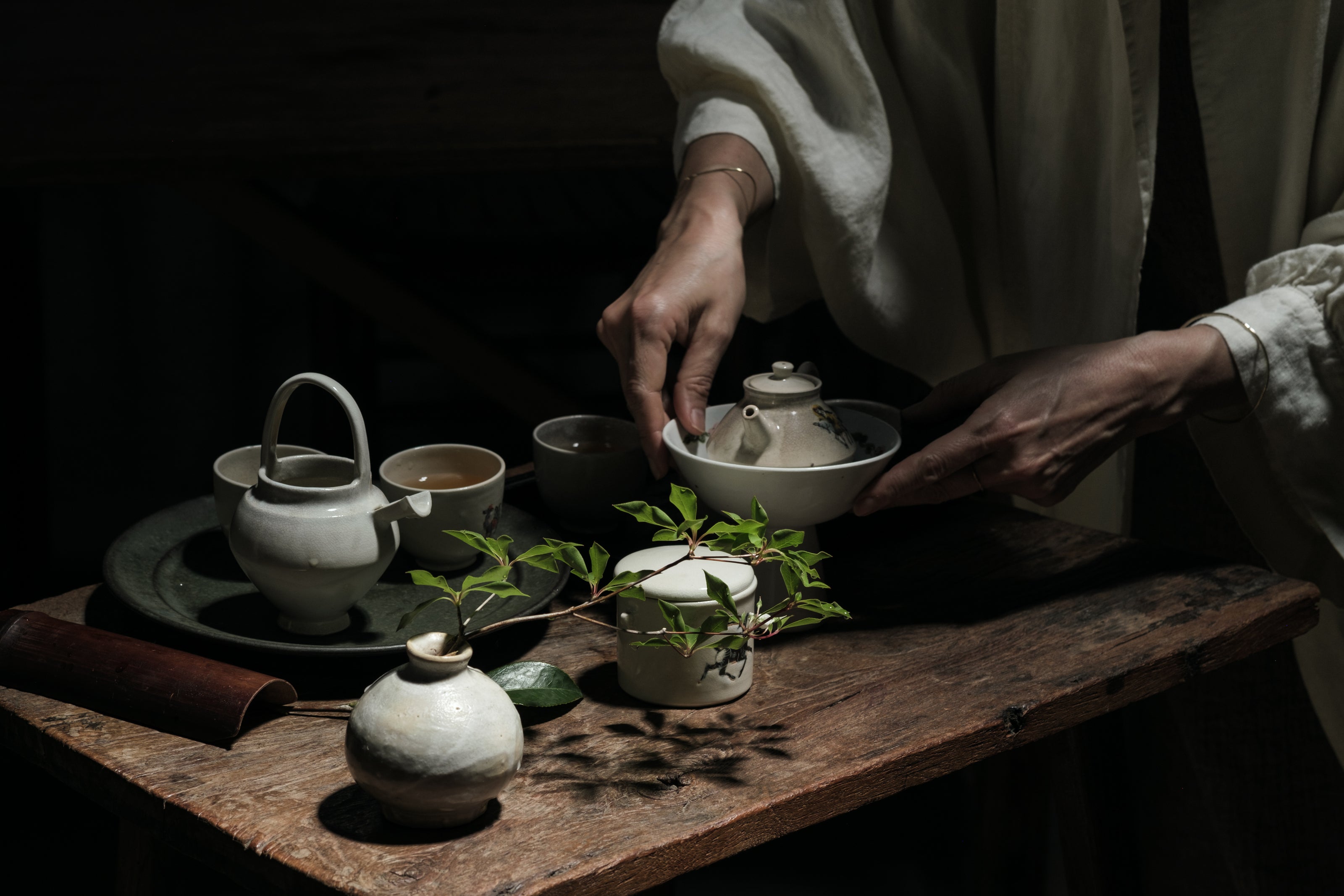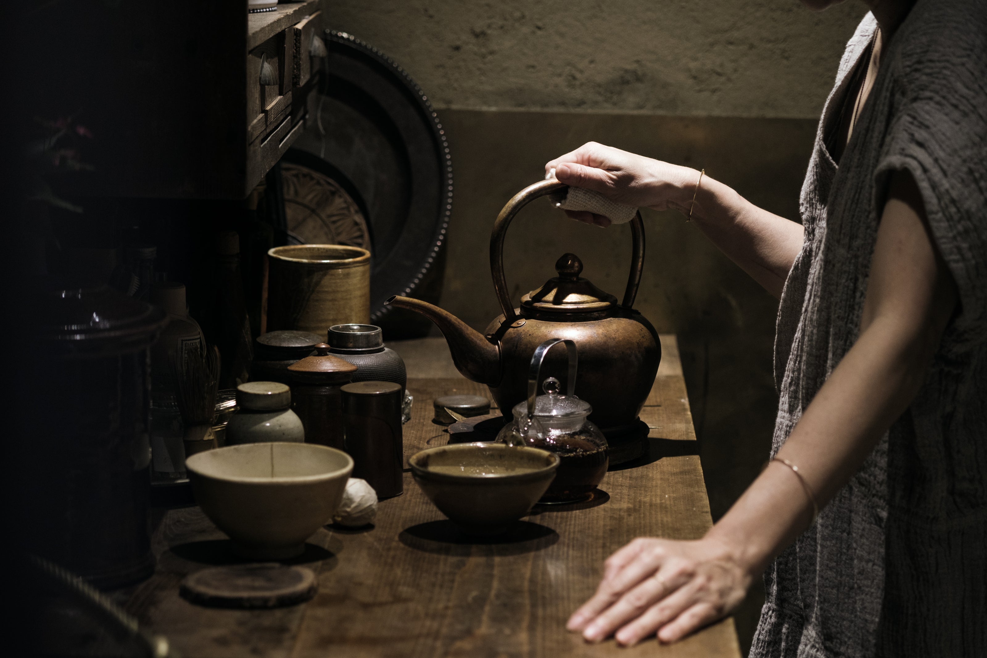 Gorgeous antique and new tea utensils (made by Ikumi Matsumoto) for the daily preparation of matcha tea.